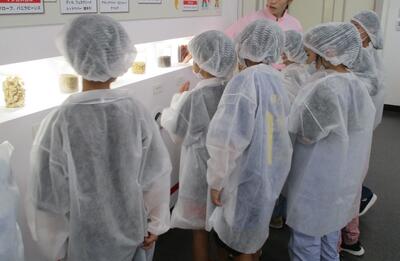 工場の概要や、見学をする際のルールについて確認した後、子どもたちは白い帽子とエプロンを身につけて、“ちびっこ工場スタッフ”に変身! 初めて着る格好に、子どもたちのテンションがどんどん高くなっていきました。