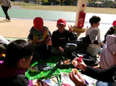 お昼は広場でお弁当を食べました。「いただきます」、「ごちそうさま」をしっかり言い、後片付けも丁寧にできました。友達と仲良くお弁当を食べる姿はとても微笑ましく、遠足ならではの楽しいひとときでした。