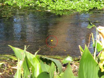 そして奇跡的に、ナガレコウホネの花が咲いているのを発見!セキショウモの間から、まるで児童たちを歓迎するかのように鮮やかな黄色い花が顔をのぞかせていました。