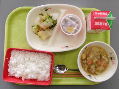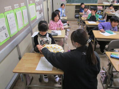 給食の時間に実食。どの班も会心の出来でした!学校で友達と作った初めての料理を満足そうに食べていました。中には「まだ食べられる!」と8杯以上食べた子も! それでも、給食センターからの給食もいつも通りに食べていたので、よほど食欲を刺激されていたようです。