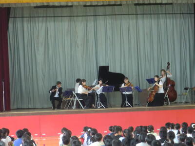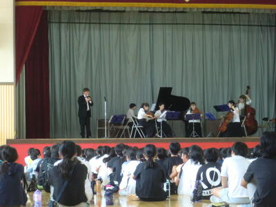 芸術鑑賞会(室内楽) 投稿: HP担当 (09/29) 9月26日(金)に、体育館で芸術鑑賞会が行われました。弦楽器とフルート・ピアノによる室内楽で演奏してくださいました。曲目は、有名な「G線上のアリア」や「情熱大陸」で、生演奏を聴くことができて、児童にとってよい経験となりました。 Tweet -
