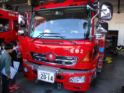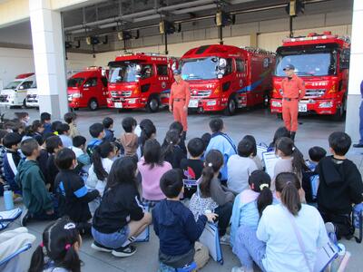 社会科の授業で「くらしを守る人々」について学んでいる3年生。今日は、佐野市消防本部へ見学に行きました。4つのクラスに分かれて、それぞれのグループで消防署の方からお話を聞いたり、施設を案内してもらったりしました。