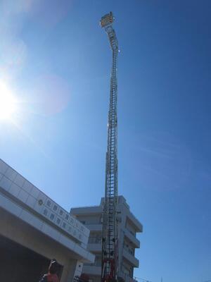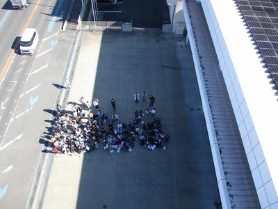 最後には、はしご車の上から写真を撮らせていただきました。児童が乗る…のはさすがに危ないので、今回は代表して教員2名と消防士さんで上へ!地上20mの高さを、身をもって体験しました。(足がすくみました…。この高さでさらに、消火活動や救助活動をする消防士の皆さん、危険で大変なお仕事をいつもありがとうございます。)みなさんがアリさんのように小さく見えました。